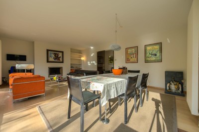Indeling : Inkomhall met vestiaire en afz. toilet. Ruime hoek living met zonnig terras en private tuin. Volledig ingerichte keuken met o.a. vaatwas- en wasmachine. 2 dubbele slaapkamers met kasten elk met een badkamer en een 2° toilet. Kelder en garage inbegrepen. Alg. onkosten, onderhoud van de tuin, water en verwarming inbegrepen.