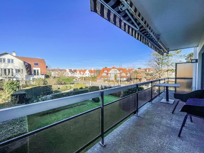 Ongemeubeld appartement met open, groen zicht en zonnig terras, gelegen in het Zoute, vlakbij de winkels van de Kustlaan. Ruime garage inbegrepen.