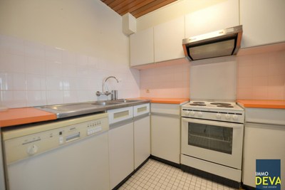INDELING: inkomhal met afz. toilet., ingerichte keuken met doorgeefluik naar de woonkamer. 2 slaapkamers achteraan, waarvan één met een terrasje. Badkamer met ligbad en lavabo. Autostaanplaats in het gebouw inbegrepen. Alg. onk. Provisie: 75E/m.