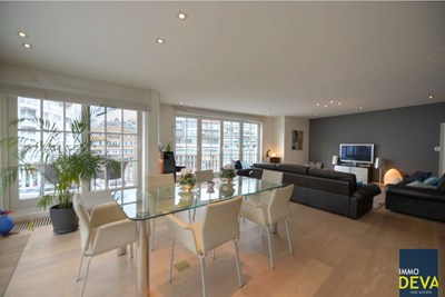 Indeling: Inkomhall met grote vestiaire, afz. toilet & berging.Zeer aangename hoekliving met een breedte van 9 meter en met terras met mooi zicht op het Driehoeksplein. Open ingerichte keuken met afzonderlijke ruime berging. 3 grote slaapkamers waarvan 2 met douchekamer en 1 met badkamer en terras. Ruime garagebox : 200 euro/maand (2,85m * 6,91m). Kelder. Algemene kosten inbegrepen. EPC: 112 kWh/m²