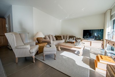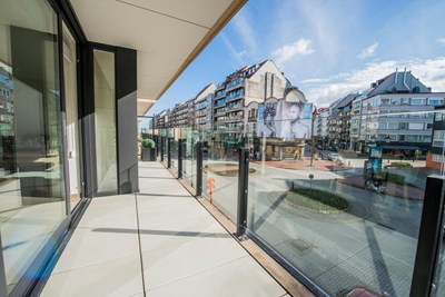 INDELING: Inkomhal met apart toilet, videofoon en ingebouwde vestiairekast. Zeer ruime living uitgevend op het terras (10m²) vooraan. Open ingerichte keuken. 2 slaapkamers met parket waarvan 1 met volledig afgewerkte dressing. Badkamer met dubbele lavabo, toilet, ligbad en douche. Douchekamer met lavabo en inloopdouche. Beide slpk geven uit op het zuid-westen gericht terras van 8,5 m². 3°slpk./ bijkeuken met plaats voor wasmachine. Kelder en fietsenberging. Parking te huur in het gebouw: 150E/M. Alg. onk. inbegrepen.