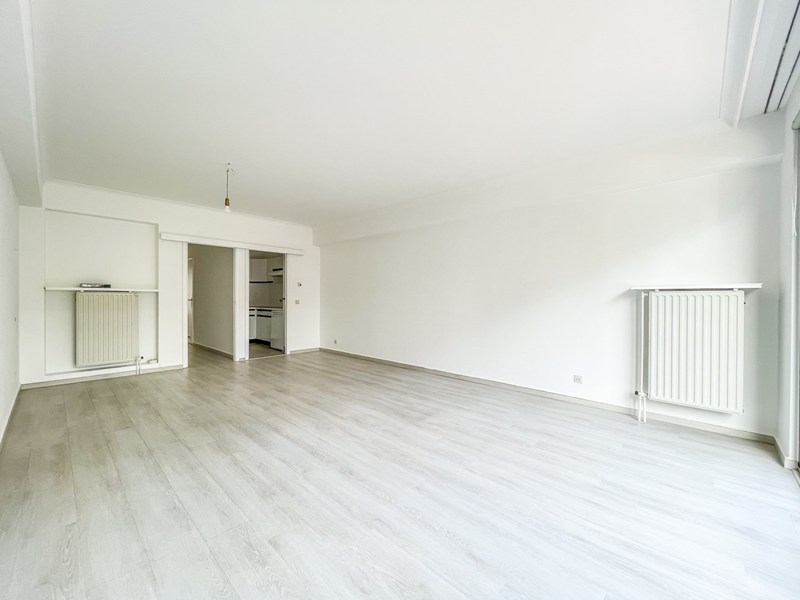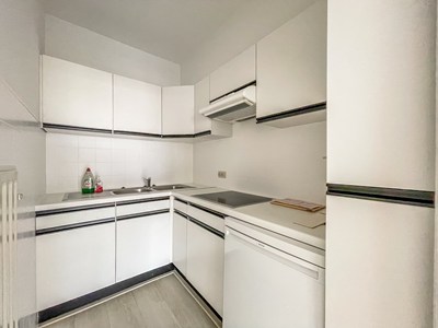 INDELING: Inkom met vestiaire en gastentoilet. Lichte leefruimte met terrasje vooraan. Ingerichte keuken. Twee slaapkamers waarvan één met ingemaakte kasten. Badkamer met ligbad en lavabo. Kelder en fietsenberging. Het appartement werd volledig opnieuw geschilderd. Alg. onkosten inbegrepen.