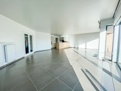 INDELING: Inkomhal met apart toilet, videofoon en ingebouwde vestiairekast. Zeer ruime living (70m²) uitgevend op het terras (10m²) vooraan. Open ing. keuken met bijkeuken (aansl. voor wasmachine voorzien). 2 slpk op parket. Badk met dubbele lavabo, toilet, ligbad en inloopdouche. Douchekamer met lavabo en douche. Terras achteraan. Kelder en fietsenberging. Parking te huur aan 150E/M. Alg. kosten inb.