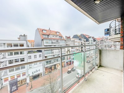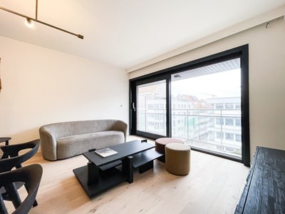 INDELING: Inkomhal, aangename leefruimte uitgevend op het zuid-west gerichte terras, eethoek en open, volledige ingerichte keuken. Ruime slaapkamer. Douchekamer met lavabo, toilet en inloopdouche. Forfait algemene onkosten: 100 EUR/maand. Berging.