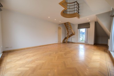 INDELING: 2° verdiep: Inkomhal met cv-berging, gastentoilet en vestiaire. Ingerichte keuken uitgevend op een zonnig terras. Ruime en lichtvolle hoekliving met parket en terrassen. Eerste dubbele slaapkamer met aansluitende badkamer met ligbad, toilet en dubbele lavabo. Tweede ruime kamer met aansluitende douchekamer met toilet. 3de Verdiep: Mezzanine (bureel ruimte). Apart toilet. Terras van ca. 16m². Kelder en gemeenschappelijke fietsenberging. Ruime garagebox inbegrepen op -1. Alg. onk. inbegrepen. .