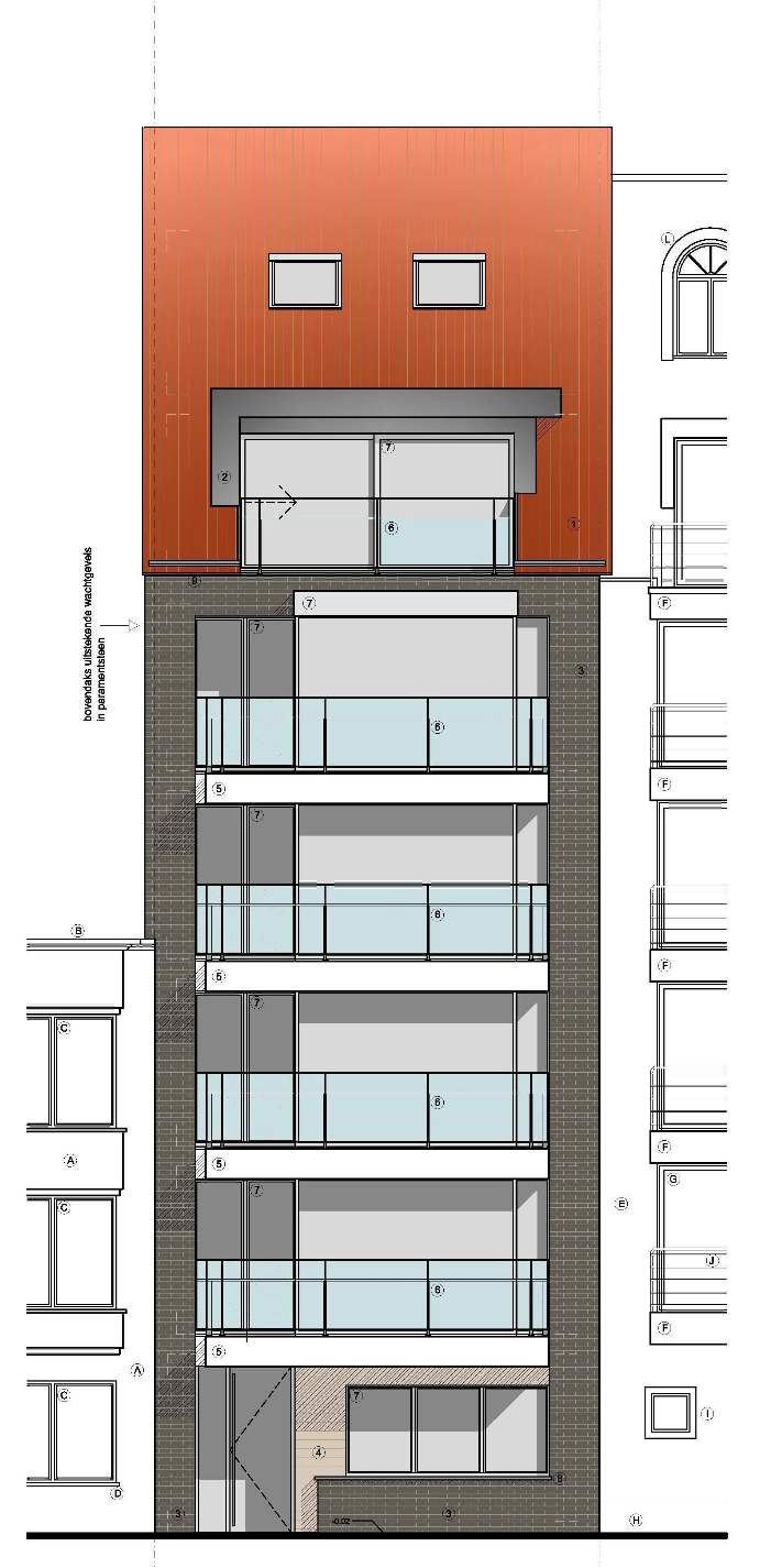 INDELING: Inkom met vestiaireruimte en gastentoilet. Ruime woonkamer (6m30 gevelbreedte) met loggia en grote glaspartijen. Ruime, volledig ingerichte keuken met eiland. Berging met aansluiting wasmachine. 3 slaapkamers allen uitgevend op het ruim zonneterras achteraan ( diepte 1m70). Badkamer met dubbele lavabo, toilet en ligbad. Douchekamer met douche en lavabo. Extra hoge plafonds ( 2m64). Kelder en fietsenberging met fietslift. De indeling van het appartement kan nog steeds aangepast worden in samenspraak met architect en bouwheer.