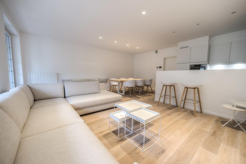 INDELING: Inkom met afzonderlijk gastentoilet en ruime C.V.-berging met waterafvoer. Volledig ingerichte open keuken. Ruime living (6,4 meter gevelbreedte!) met eet- en zithoek en een oost-zuid terras van 9 m². 2 slaapkamers – beide voorzien voor een dubbel bed – waarvan 1 met badkamer( dubbele lavabo en ligbad) en de andere slaapkamer met douchecel. Terras aan de achterzijde. Parking te koop aan 55.000 EURO.
