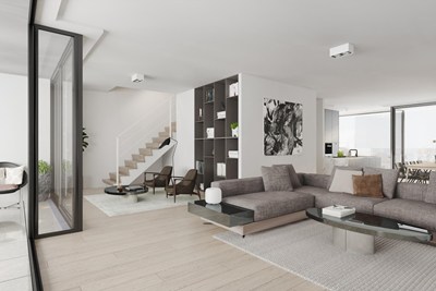 INDELING: Inkom met gastentoilet en C.V.-berging. Ruime en lichtvolle living ( met aansluiting gashaard) uitgevend op het zuid-westen gericht terras ( 2m10 tot 3m diep). Volledig ingerichte, luxueuze open keuken . 3 slaapkamers, allen uitgevend op het terras achteraan. Master met dressing en badkamer met ligbad, douche, dubbele lavabo en toilet. 2 aansluitende douchekamers aan de andere slpk. Plafondhoogte van 3m. Fietsenberging op het gelijkvloers met aparte uitgang. Garages te koop op het gelijkvloers (ca. 2m90 /7m).