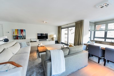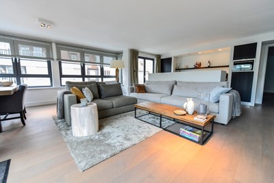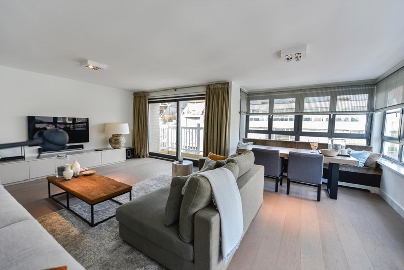 Recent hoekappartement luxueus afgewerkt met hoogstaande materialen gelegen in het centrum van Knokke op de Dumortierlaan .