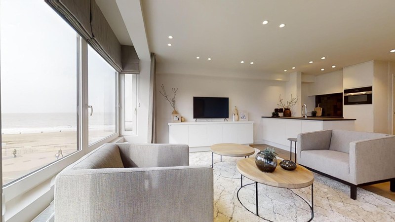 Indeling: Inkom met vestiaire en apart toilet. Aangename woonkamer met zuid-westoriëntatie; de zit- en eethoek hebben zicht op zee. Volledig ingerichte open ingerichte keuken (Miele apparatuur). 2 slaapkamers met ingemaakte kasten en aansluitende doucheruimte. Ruimte met wasmachine en droogkast ( inbegrepen). Terras voor- en achteraan. Het appartement wordt volledig ingericht verkocht. Kelder.