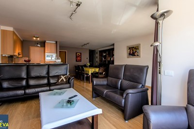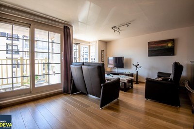 INDELING: Inkomhal met vestiaire en gastentoilet. Ruime brede living met zit- en eethoek uitgevend op het zonnig terrasje vooraan. Volledig ingerichte open keuken met aansluitend de berging (aansl. wasmachine voorzien). Twee ruime slaapkamers (beiden geschikt voor dubbel bed), waarvan één met badkamer (dubbele lavabo, ligbad en toilet), afzonderlijke douchekamer. Kelder. Mgl. tot aankoop van parking in het gebouw: 70.000E