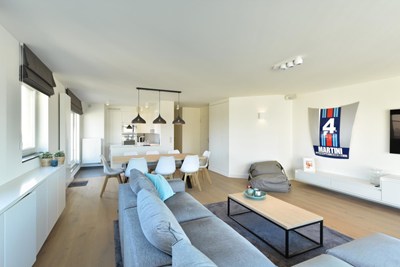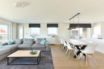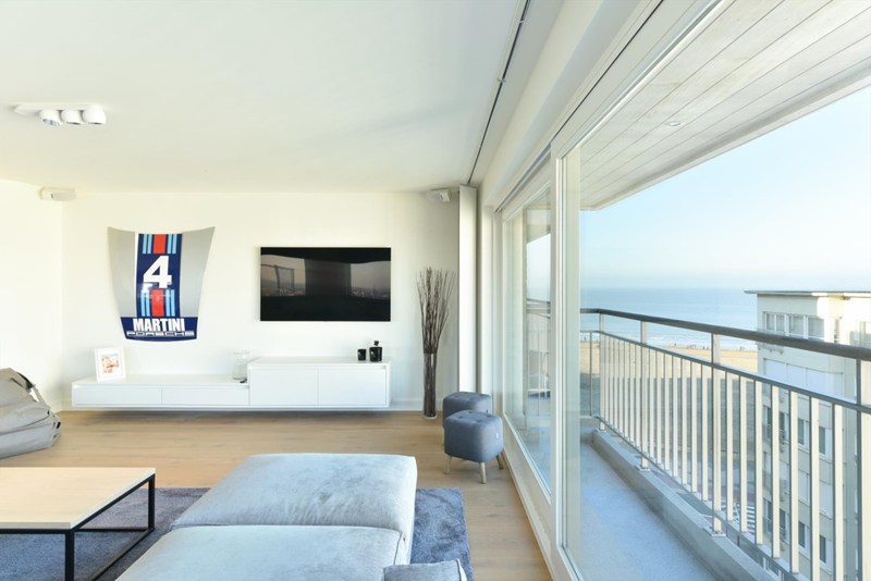 Recent hoekappartement met zijdelings zeezicht en ruim zonneterras met prachtig zicht op het Knokse hinterland. Garages te koop in het gebouw.