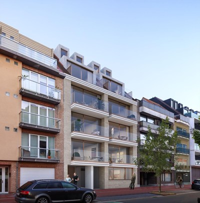 Nieuw appartement van 90,9m² met 11,2m² terras gelegen in de Paul Parmentierlaan. Inpandige garages te koop.