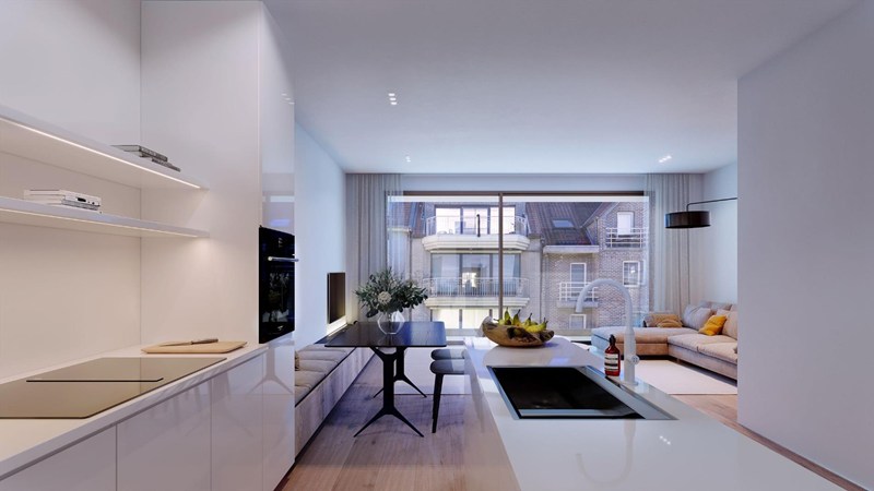 Nieuw appartement van 90,9m² met 16,9m² terras gelegen in de Paul Parmentierlaan. Inpandige garages te koop.