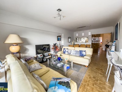 INDELING: Inkom met apart toilet , vestiaire en berging. Zuid/westen gerichte living met mooi groot terras en ZIJDELINGS ZEEZICHT. Ingerichte open keuken. 2 volwaardige slaapkamers voor dubbel bed. Badkamer met ligbad. Kelder en fietsenberging. Ruime garagebox te koop in de residentie zelf: €150.000 EUR
