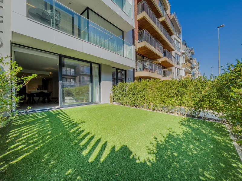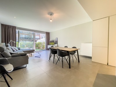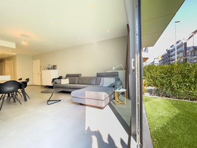 Luxueus hedendaags tuinappartement (104m²) met 3 slpk., terras en voor- en achtertuin in een klein recente residentie in een moderne bouwstijl gelegen op de Leopoldlaan vlakbij de Zeedijk.