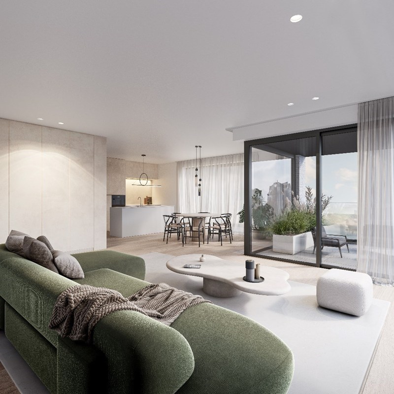 INDELING: Inkomhall met gastentoilet. Royale hoekwoonkamer uitgevend op een ruim hoekterras (21m²). Volledig ingerichte open keuken met aansluitende berging. Het leefgedeelte heeft een gevelbreedte van ca. 12 meter. 3 volwaardige slaapkamers voor dubbel bed. Douchekamer met dubbele lavabo en toilet. Tweede douchekamer met dubbele lavabo. Plafondhoogte van 2m80. Individuele kelder en gemeenschappelijke fietsenberging. Mogelijkheid tot aankoop van een enkele of dubbele garagebox.
