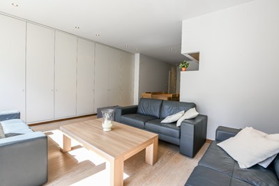 INDELING: Ruime inkomhal met grote vestiaire en ingemaakte kasten. Gastentoilet met handenwasser. Zuidgerichte living met terras vooraan. Eethoek. Volledig ingerichte keuken. Twee slaapkamers, waarvan één met douchekamer en één met badkamer. Beide slaapkamers geven uit op het terras achteraan. Grote berging met aansl. wasmachine. Fietsenberging. Garage op het gelijkvloers, rechtstreeks toegankelijk vanop straat: 85.000 EUR.