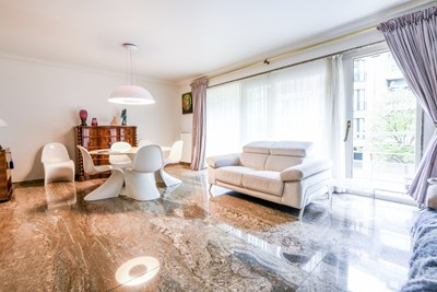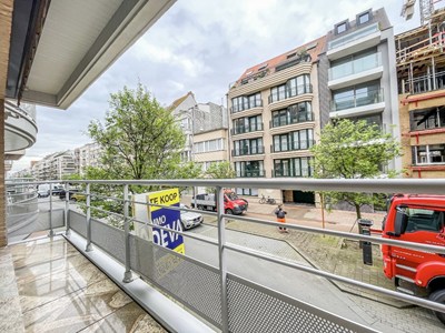 INDELING: Inkomhal met vestiaire, apart toilet, veiligheidsdeur en berging. Ruime woonkamer uitgevend op het zuid-westen gericht terras. Volledig ingerichte keuken. 2 slaapkamers met ingemaakte kasten uitgevend achteraan op de veranda en het ruim terras. Badkamer met ligbad, douche, dubbele lavabo en toilet. Parking op het gelijkvloers: 60.000 EUR. Het appartement werd volledig afgewerkt met marmer. Fietsenberging op het gelijkvloers. Renovatieplicht.