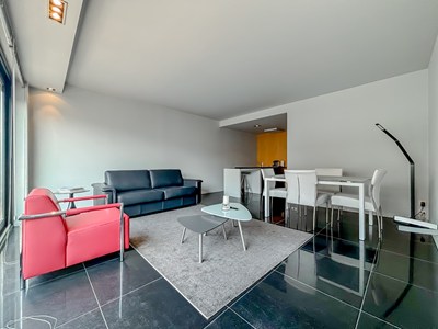 INDELING: Inkomhall met vestiaire en nutsberging met aansluiting wasmachine. Zonnige woonkamer uitgevend op het zuid-gewest gericht terras (voorzien van elektrische sunscreens). Douchekamer met toilet. open lavabo met dressing ruimte. Ingerichten open keuken (Bulthaup met Gaggenau toestellen). Fietsenberging en individuele kelder.