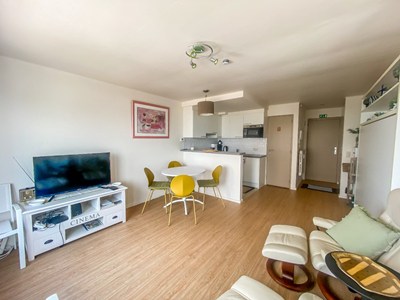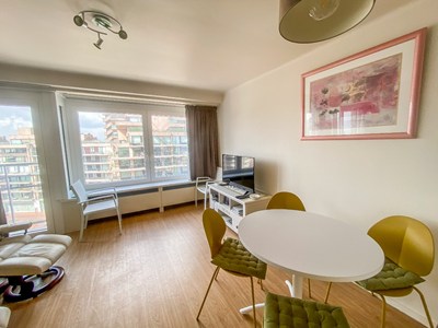 INDELING: Zonnige woonkamer met zuid-west oriëntatie met OPEN ZICHT op het plein en ZEEZICHT. Elektrische zonnewering. Balkon. Open volledig ingerichte keuken. Doucheruimte met inloopdouche, lavabo en toilet. De meubels zijn gratis met een uitklapbaar dubbel bed. Fietsenberging op het gelijkvloers. Individuele kelder.