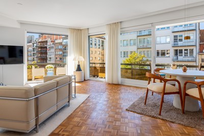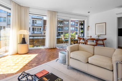 Zonnig en lichtrijk volledig gerenoveerd hoekappartement op de hoek van de Zoutelaan en Lippenslaan met 2 slaapkamers. Indeling: inkomhal met apart gastentoilet, ruime en zeer lichtrijke leefruimte met zit- en eethoek, volledig ingerichte keuken, twee volwaardige slaapkamers en een moderne ruime douchekamer in mortex voorzien van een inloopdouche, dubbele wastafel en toilet. Inclusief private kelderberging en gemeenschappelijke fietsenberging ( 2 plaatsen). Airco inverter aanwezig. Mogelijkheid tot aankopen van een parking aan overzijde : € 51.000.