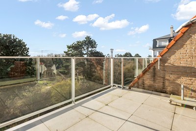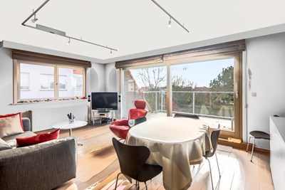 Zeer zonnig hoekappartement met zuidgericht terras, groen open zicht op Park 58 aan de rand van Duinbergen. Garage te koop in de residentie.