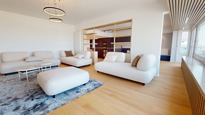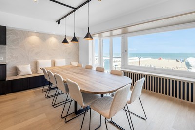 Royale leefruimte (ca. 70m²) met living en eetruimte, allen genietend van een prachtig frontaal zeezicht. Volledig ingerichte open leefkeuken met bar en o.a. wijnfrigo. 3 ruime slaapkamers met ingemaakte kasten en elektrische rolluiken uitgevend op het terras achteraan. De andere 3 slaapkamers liggen in de binnenzijde van het appartement en geven uit op aera's. De 6de slaapkamer kan ook ingericht worden als wasberging. Er zijn 3 badkamers waarvan 2 ensuite douchekamers met douche en een badkamer met ligbad. Er zijn 3 toiletten in het appartement ( gastentoilet). 2 individuele kelders, gemeenschappelijke fietsenberging. Mogelijkheid aankoop inpandige parkeerplaats aan €120.000 (toegang via Jozef Nellenslaan).