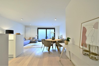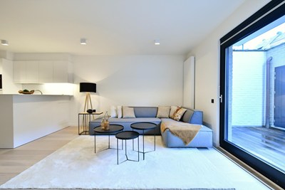 INDELING: Inkomhal met berging en gastentoilet. Aangename, lichtvolle living uitgevend op het ruim terras (23m²). Volledig ingerichte open keuken. 2 slaapkamers. Douchekamer met inloopdouche en dubbele lavabo. Kelder en fietsenberging. Verkoop onder registratierechten!