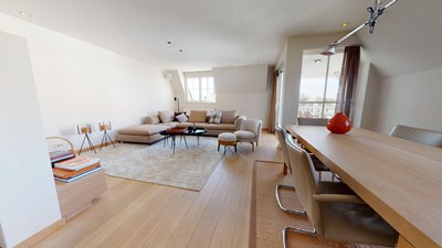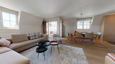 Magnifiek hoekduplex dakapp. met de ideale zuid-west oriëntatie, ruim terras met open zicht, prachtig gelegen vlakbij het strand en het winkelcentrum tussen het Albertplein en het Driehoeksplein. Garages te koop in de residentie (-1).