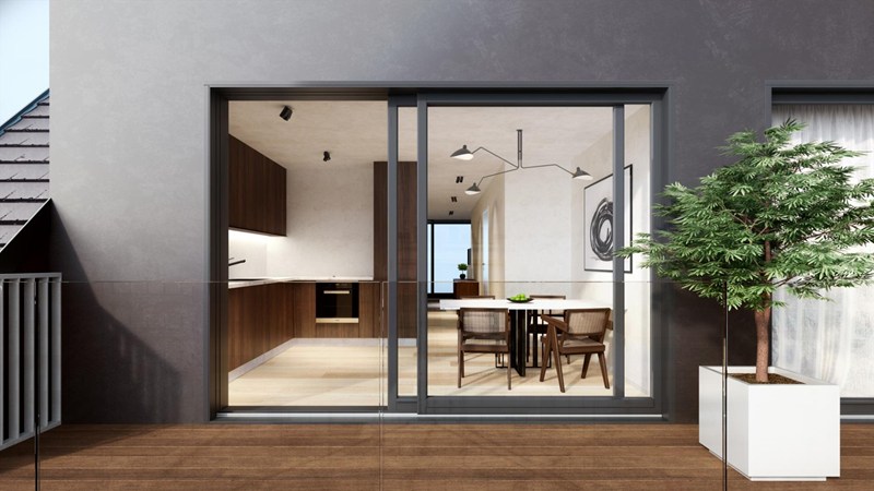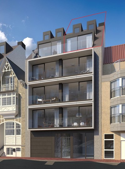 Zuidgericht, luxueus afgewerkt nieuwbouw duplex dakapp. met zonneterrassen in een rustige éénrichtingsstraat vlakbij de Lippenslaan. Garages te koop op het gelijkvloers en -1.