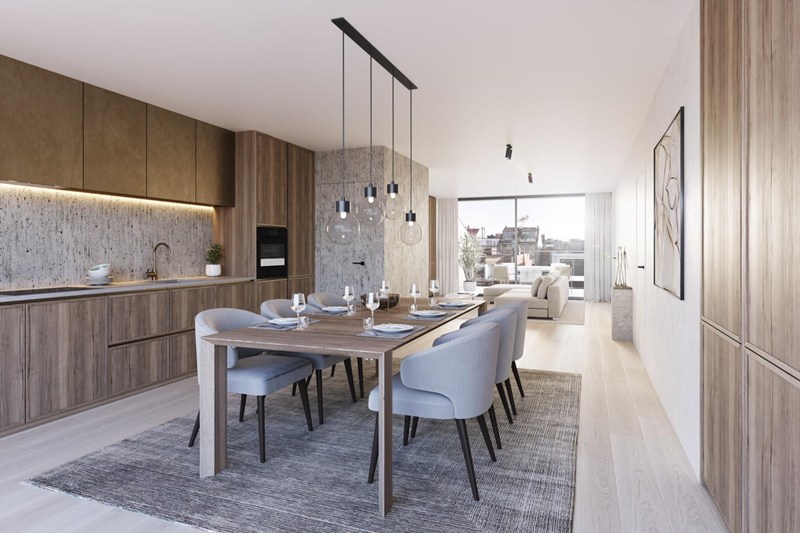 Nieuw duplex dakapp. van 144 m² , met 2 mooie terrassen, gelegen nieuw architecturaal hoekproject in de Leopoldlaan op wandelafstand van het Rubensplein, de Zeedijk en de winkels. INDELING:5de verdiep: Inkomhall met gastentoilet, vestiaire. Zonnige woonkamer uitgevend op het ruim terras vooraan. Volledig ingerichte leefkeuken met eethoek en berging met aansl. wasmachine. Zuid-west terras achteraan. 6de verdiep: Nachthall met apart toilet. 3 volwaardige slaapkamers. Bad- en douchekamer. Ruime fietsenberging op het gelijkvloers. Individuele kelder. Ruime garageboxen te koop: vanaf € 72.100 EUR.