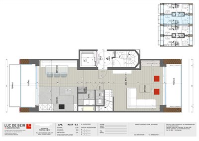 INDELING: 5de verdiep: Inkomhall met gastentoilet, vestiaire en berging met aansl. wasmachine . Zonnige woonkamer uitgevend op het ruim terras. Volledig ingerichte leefkeuken eethoek uitgevend op het zuid-west terras achteraan. 6de verdiep: Nachthall met apart toilet. 3 slaapkamers. Bad- en douchekamer. Ruime fietsenberging op het gelijkvloers. Individuele kelder. Zonnepanelen individueel voorzien op de elektriciteitsmeter van dit appartement. Ruime garageboxen) te koop: vanaf €75.000 en parkings te koop aan €60.000. Bezoek het modelappartement in een gelijkaardige residentie !