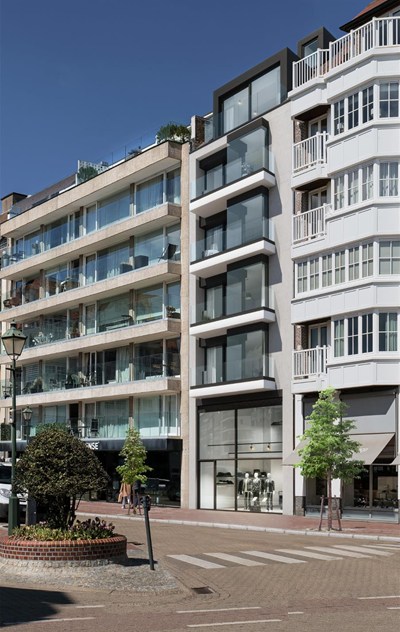 INDELING: Op het 5de verdiep: Zuidgerichte woonkamer met zonnig terras en zicht op het Driehoeksplein. Volledig ingerichte open keuken. Gastentoilet. Slaapkamer. 6de verdiep: masterbedroom met dressing en aansluitende douchekamer. Kelder.