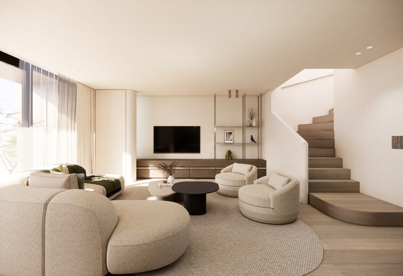 INDELING: Inkom met sas, berging en gastentoilet. Ruime living met een gevelbreedte van ca. 8 meter uitgevend op het zuidgericht terras ( 14m²). Volledig ingerichte leefkeuken met eetruimte uitgevend op het terras. Ruime wasberging. Verdiep: Nachthall met apart toilet en douchekamer. Master slaapkamer met ruimte voor dressing en aansluitende badkamer met ligbad, douche, toilet en dubbele lavabo. Slaapkamers 2 en 3 voor dubbel bed. Duurzaam en energiezuinig appartement met vloerverwarming (warmtepomp) en zonnepanelen voorzien per appartement. Kelder en fietsenberging.