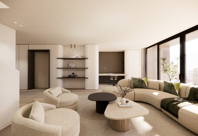 Nieuw duplex dakapp. van 177m² met 21m² terrassen in een hedendaags en stijlvol nieuwbouwproject gelegen op aan zuidkant van het vernieuwde Burg. Fr. Desmidtplein met open zicht vlakbij de Lippenslaan.. Gevelbreedte van ca. 8 meter.