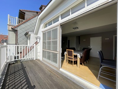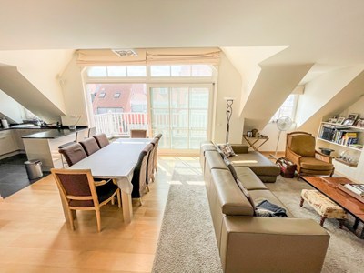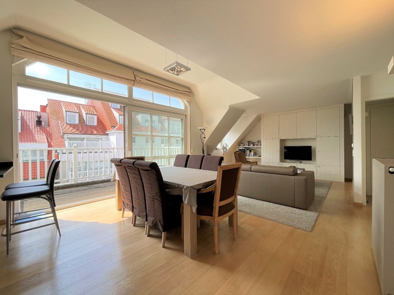 Zonnig duplex dakapp. gelegen in een rustige éénrichtingsstraat vlakbij de Dumortierlaan en de Zeedijk. Uitzonderlijke gevelbreedte van meer dan 10m. Kleine residentie met slechts enkele mede-eigenaren.INDELING: Ruime woonkamer met zit- en eethoek uitgevend op het zuid-west gericht terras (ca. 12m²). Aansluitend volledige ingerichte open keuken voorzien van alle toestellen ( incl. Amerikaanse frigo). Hall met gastentoilet en C.V.-berging. 2 slaapkamers met ingemaakte kasten. Douchekamer. Op het verdiep: Ruime slaapkamer met ingemaakte kasten. Ruime badkamer met ligbad, inloopdouche en lavabo. Overloop met veel kastruimte en apart toilet. Vloerverwarming beneden. Kelder (10m²) en fietsenberging.