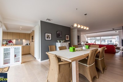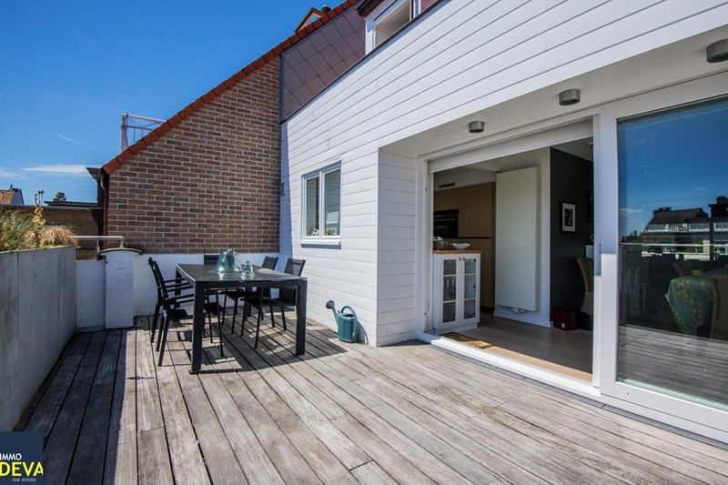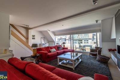 Duplexdakappartement met 2 zonneterrassen op de Kustlaan vlakbij het Driehoeksplein. Indeling: 5de verd.: Inkomhal met vestiaire kast en afz. toilet. Heel ruime living met zithoek met open haard en eethoek . Groot zonneterras voor en achter. Volledig ingerichte keuken (vaatwas, keramische kookplaat, oven, frigo, dampkap e.a) 6de verd.: 3 slaapkamers met inbouwkasten, badkamer met douche, lavabo en ligbad. 2° douchekamer en afz. toilet. Ruime kelder (met plaats voor fietsen).