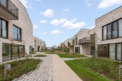 Moderne, bel-étage nieuwbouwwoning met mooie zonneterrassen en dubbele, ondergrondse garagebox gelegen in een autovrije en groene omgeving aan de rand van Knokke, op enkele minuten van het centrum.
